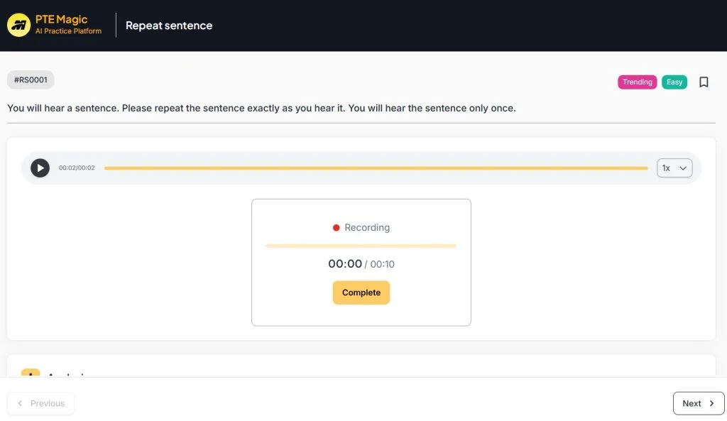 Lời khuyên từ giáo viên: Bình tĩnh nghe và đọc một mạch đến hết câu. Không cần lặp lại toàn bộ và tự động next ngay khi làm xong.