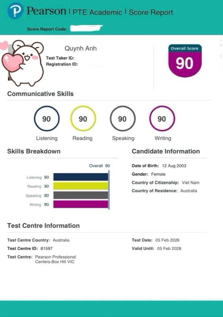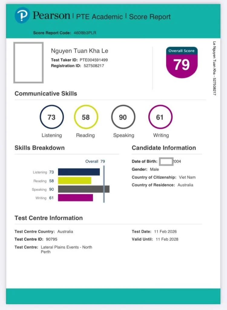 “Hí mng, chia sẻ 1 tí về trải nghiệm thi PTE của mình ở West Perth nhá.Mình thi ngày 12/2 thì phải hong nhớ luôn =))) Giám thị ở đây khá là nghiêm ngặt và không vui tính… Nhưng bù lại là csvc như là mic máy tính bàn phím mọi thứ đều okay hết (Trông giao diện thi như những năm 90s á?). Mình đăng ký học PTE 1:1 3 tuần với cô Maria Vũ, cô sieuuuu dễ thương và tận tình luôn. Cách dạy của cô dễ tiếp cận và hài hoà nên môi trường học siêu thoải mái, dễ tiếp thu, học toàn là cười hong à nma rất professional nha. Target của mình là vừa đủ 55 cho Visa 485 thôi =))) nma mình muốn thử sức cao hơn nên team Magic cũng sẵn lòng giúp đỡ luôn ạ, đến khi có điểm hết hồn? 79 total giỡn quàiVài lần mình học theo tricks của cô giao điển hình như template của DI, áp dụng vào rồi check điểm như Magic luôn, tại điểm cao vãi? Howw? =))). What I mean here is mình khá may mắn khi gặp cô kk, mng chỉ cần siêng ôn template, giải đề và xin team các mini test mỗi khi ôn xong để biết được mình tới đâu nhá.Đừng có lười luyện reading ( như mình =)))))…)Học thuộc template là chính, bữa đi thi t bị bắt chép template ra nháp trước khi bắt đầu thi hên mà ko sao chỉ bị tịch thu lại nháp =))))) risky lắm.Ngoài ra website ôn thi khá là user-friendly nha, có bộ tủ cho mng luyện luôn, ngày luyện 3 tiếng là đủ rồi ạ. Thank you team PTE Magic đã hỗ trợ mình trong quá trình luyện thi nhen, rất là recomend mng nên personally pick cô Maria Vũ=)))) kk”