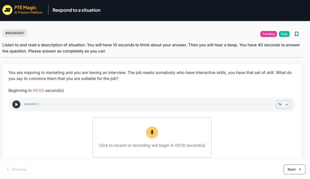 Vì bản giới thiệu này sẽ được gửi kèm chung với hồ sơ du học, và đây cũng là phần để làm quen với giao diện bài thi, thư giãn trước khi bắt đầu làm bài chính thức. Bên cạnh đó, khi làm phần này AI của bài thi sẽ nhận diện âm giọng và bắt âm thanh theo cường độ âm thanh của bạn tốt hơn.