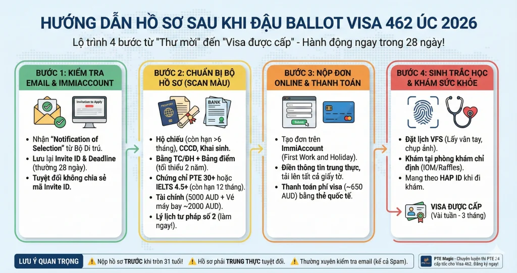 Chúc mừng bạn đã vượt qua hàng ngàn ứng viên để nhận được “tấm vé may mắn” từ đợt Ballot visa 462 Úc năm 2026. Tuy nhiên, nhận thư đậu mới chỉ là 50% chặng đường. Bạn chỉ có 28 ngày để hoàn tất hồ sơ, nếu chậm trễ, cơ hội sẽ trôi qua vĩnh viễn.