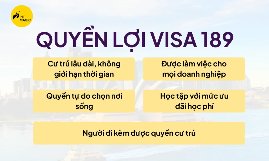 | Quyền cư trú | Người giữ visa 189 được sinh sống lâu dài tại Úc mà không giới hạn thời gian, miễn tuân thủ đầy đủ quy định pháp luật. |