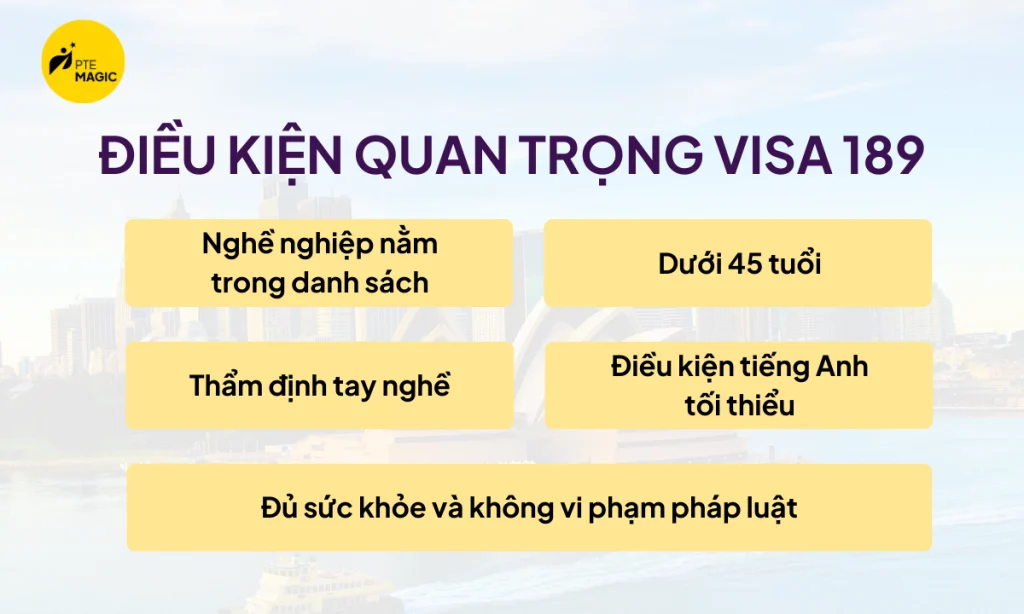 Visa 189 là diện tay nghề độc lập, do đó hồ sơ cần đáp ứng đầy đủ các điều kiện cơ bản trước khi được xét điểm và khả năng nhận thư mời. Các yêu cầu này được chia thành 3 nhóm điều kiện chính, bao gồm: điều kiện bắt buộc, thẩm định tay nghề và yêu cầu về trình độ tiếng Anh.